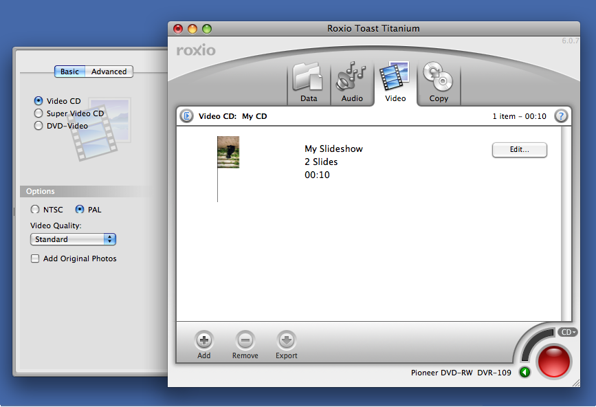 Als je alle foto’s in een mapje hebt verzameld, dan kun je ze op een CD zetten. Die CD kun je bewaren of inleveren bij een fotozaak. Daar kunnen ze alsnog afgedrukt worden. Voor het branden van de CD gebruik je een brandprogramma, zoals bijvoorbeeld NERO of Toast. In dit voorbeeld maken we gebruik van Roxio Toast Titanium. Selecteer het tabblad ‘Video’ en sleep het mapje met de foto’s naar het venster. Druk vervolgens op de rode knop en je CD wordt gebrand!