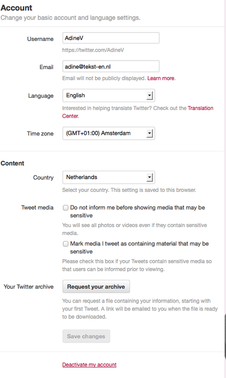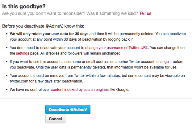 Twitter ziet je liever niet verdwijnen en vraagt je daarom nog of je het zeker weet. Lees de informatie in dit scherm goed door, zodat je weet wat de gevolgen zijn van het deactiveren van je account. Houd er rekening mee dat je 30 dagen de tijd hebt om je account weer te heractiveren. Doe je dat niet, dan wordt al je informatie van Twitter verwijderd.