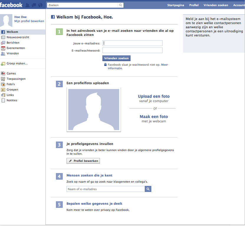 Als je weer terug gaat naar de website en inlogt met je registratiegegevens, dan kun je je huidige profiel bekijken. Je hebt dan alsnog de mogelijkheid om de gegevens aan te vullen. Ook kun je berichtjes sturen en bekijken, evenementen plaatsen, spelletjes spelen en groepen opzetten of je aansluiten bij groepen. Ook kun je nu door andere Facebook-leden gevonden worden. Kortom, het netwerken kan beginnen!