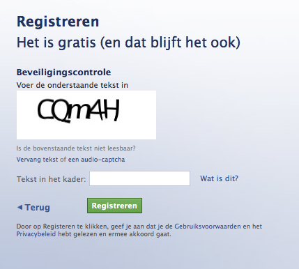 Hierna verschijnt een scherm waar je nog een extra beveiligingscontrole moet doorlopen. Tik de code over in het vakje. Klik dan niet direct op registreren, want in dit venster vind je ook nog een link naar de voorwaarden. Lees die even goed door, zodat je weet waar je mee akkoord gaat als je je aanmeldt. Zo geef je Facebook bijvoorbeeld het recht om de door jou geplaatste foto's te gebruiken. Als je dit niet wilt, heeft aanmelden (of foto's plaatsen) weinig zin.