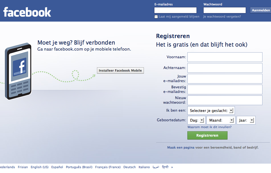 Voor je een profiel op Facebook aan kunt maken, moet je je eerst aanmelden. Surf hiervoor naar www.facebook.com. Je krijgt dan een registratieformulier te zien. Vul hier je voor- en achternaam, je mailadres en je wachtwoord in. Vermeld ook je geslacht en geboortedatum en klik vervolgens op de knop 'Registreren'.