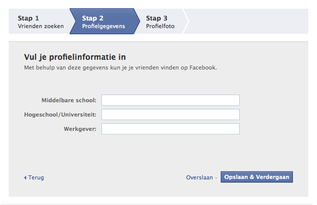 Als je liever eerst even kijkt naar wat Facebook precies is, kun je onderaan het scherm ook klikken op 'Deze stap overslaan'. -