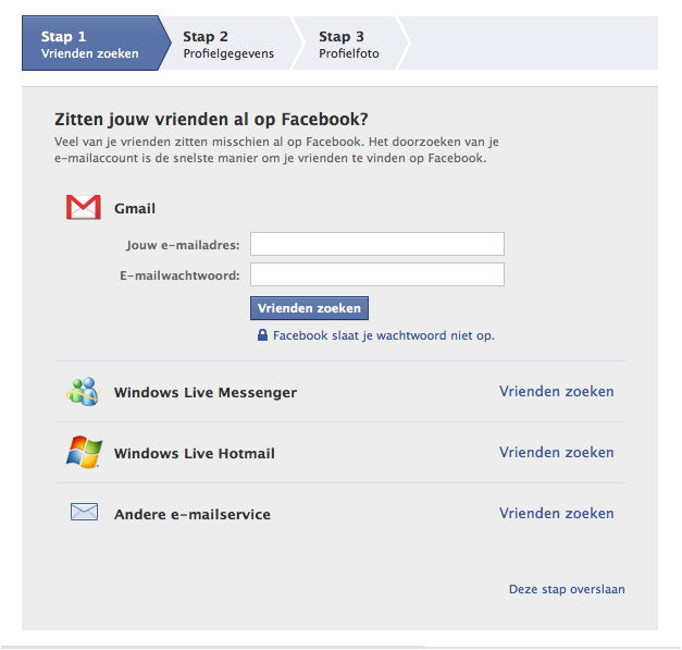 Het is natuurlijk leuk als je ook direct wat mensen toe kunt voegen aan je vriendenlijst. Facebook helpt daarmee door je naar vrienden te laten zoeken met behulp van je mailadres. Als je Gmail, Windows Live Messenger, Windows Live Hotmail of een ander mailadres hebt, dan kun je je hiermee aanmelden. Facebook kijkt dan aan de hand van je adressenboek(en) welke contacten al lid zijn bij Facebook en geeft je de mogelijkheid die mensen meteen uit te nodigen.