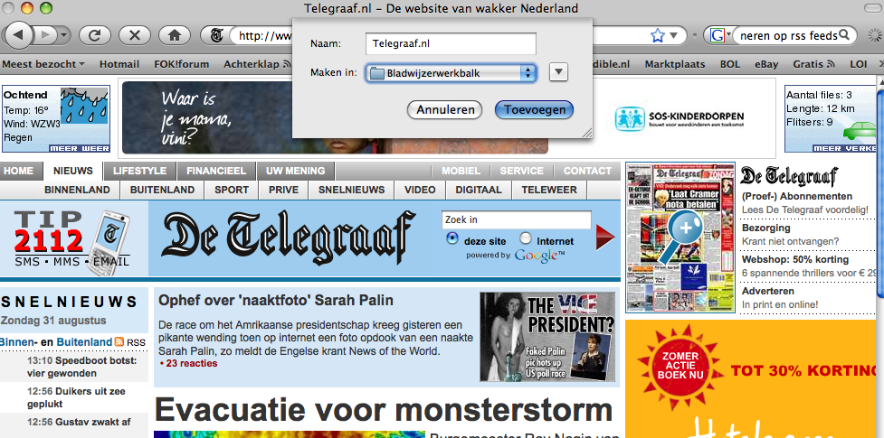 Wanneer je op RSS klikt, opent zich een nieuw scherm waarin je aan kunt geven waar je je RSS-feed wilt plaatsen. Het is het handigst als je hier ‘Bladwijzerwerkbalk’ aanklikt, omdat je RSS-feed dan in je werkbalk komt te staan. Je hoeft hem dan niet eerst uit te zoeken tussen je bladwijzers, maar ziet hem direct staan. Druk vervolgens op Toevoegen.