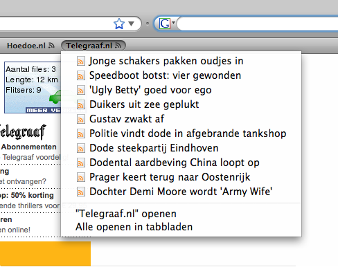 Wanneer je nu in je adresbalk kijkt, dan zie je dat er nu ook ‘Telegraaf’ met een RSS-logo ervoor staat (of een andere naam, als je je feeds anders genoemd hebt, of jezelf op de RSS-feeds van een andere website geabonneerd hebt). Wanneer je hierop klikt verschijnt er een menu met alle meest up to date berichten op deze website. Selecteer één van deze nieuwsberichten om naar de betreffende pagina te gaan. Je RSS-feeds worden de hele dag door geüpdatet, dus je bent altijd bij met de laatste nieuwtjes!