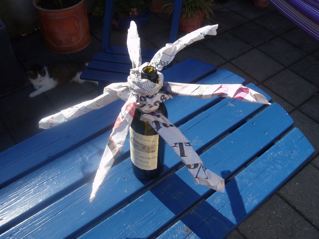 Duw de papieren slierten met de knoop op de flessenhals. Schik ze zo dat de zes papieren tentakels die vanaf de flessenhals vertrekken, gelijkmatig verdeeld zijn over een denkbeeldige cirkel. Let erop dat de knopen redelijk strak rond de flessenhals zitten.