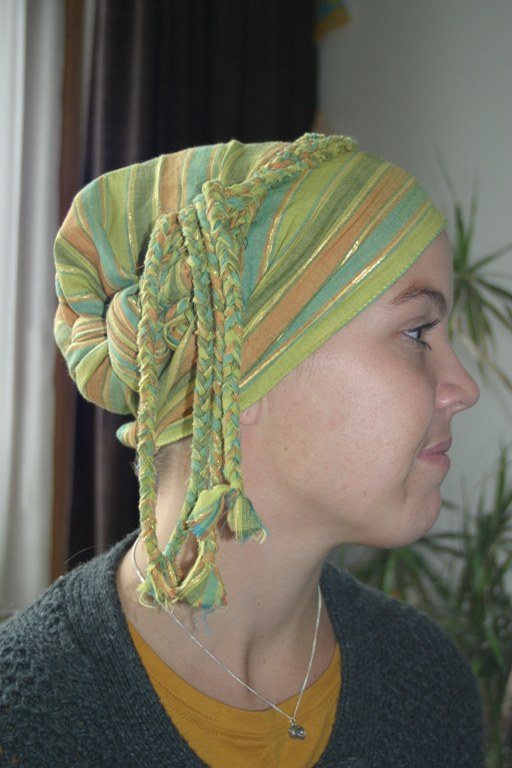 De stof die rechts hangt, heb je ingedraaid en is een soort van lange slang. Draai deze net zolang door totdat de stof in elkaar gaat krullen. Neem vervolgens de lap stof die links hangt en vouw deze over je hoofd (deze stof kan, maar hoeft niet gedraaid te worden). Knoop de linker- en rechterzijde aan de rechterkant van je hoofd aan elkaar vast in een knoop onder of boven de oor.