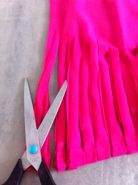 Knip nu vanaf de onderkant rechte stroken tot ongeveer het midden van het shirt. Doe dit over de gehele breedte.