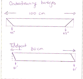 Voor het onderstel heb je twee balken van 100 cm. nodig en de vier poten. We beginnen eerst met de ondersteuning van de bankjes. Deze twee balken moet je, net als in de voorgaande stap, aan de uiteinden in een hoek van 45 graden zagen (zie tekening).