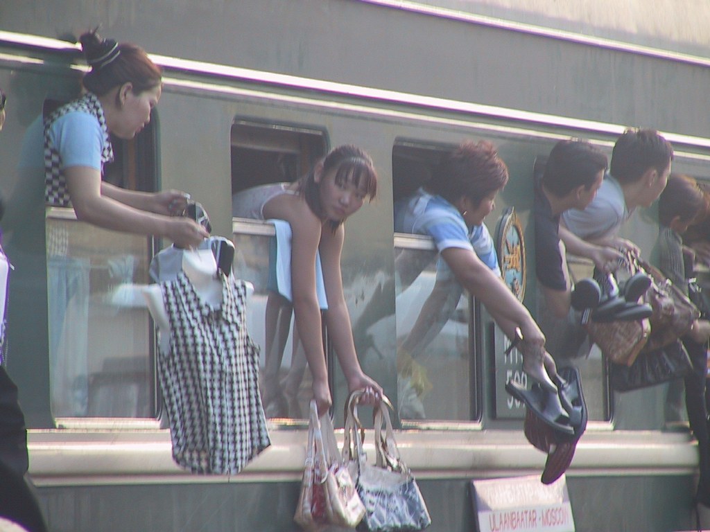 “De klok in de trein tikt gestaag door en tussenstops vormen een welkome onderbreking van het trage leven op het spoor. Weer of geen weer, op elk Siberisch perron staan tientallen (soms honderden) Russen gretig uit te kijken naar de komst van nieuwe mode uit Moskou. Dat de trein over niet al te lange tijd zal gaan stoppen, merken we aan de onrust en de toenemende bedrijvigheid van de Mongoolse kooplui in onze wagon. Opgewonden handelaren, beladen met koopwaar en dummy’s van vrouwentorso’s in sexy bloesjes of topjes, beginnen zich in het gangpad te verzamelen. Een lange stoet verkopers kissebist om de beste plek, die zo dicht mogelijk bij de uitgang is. Is het perron nog maar net in zicht, dan vliegen de deuren al open: één voor één springen de gretige kooplui uit de steeds langzamer rijdende trein. Koopgrage Russen sluiten hen in en zodra de trein stilstaat stormen de kooplui achterin naar voren. Waag het niet hen de weg te blokkeren, want voor de handel moet alles en iedereen wijken. Sta je in de weg, dan krijg je een snauw, een dauw of een vuile blik toegeworpen. Kan de tijd toeristen gestolen worden, voor kopers en kooplui is elke minuut geld. Deals moeten snel gesloten worden. Zeer snel, want in het gunstigste geval stopt de trein slechts twintig minuten. Zelfs bij een stop van vijf minuten stopt worden er spullen verhandeld. Vrouwelijke handelaren hangen uit half geopende ramen en schreeuwen de prijzen van bengelende gympies en tasjes naar iedereen die het wil horen.” -