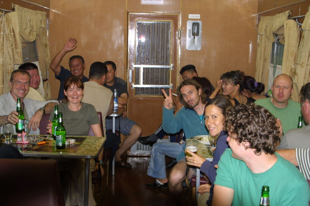 Op de enige plek met airco, pivo, wodka en champagnski is het gezellig socialiseren met mensen uit allerlei landen. De uitbater in onze trein is Sacha. Het is een bonk van een ongeschoren Rus met handen als kolenschoppen, tattoes, grijs krullend haar, grote snor, brutale grijns en diepblauwe ogen. Luna is de knappe serveerster met minuscuul rokje, prachtige benen en megahakken die ze na 24 uur serveren verruilt voor sloffen. ‘Chieken, zoep, miet' is Luna’s menukaart. Terwijl wij door de schommelende wagon schuifelen presteert deze jonge Russische vrouw het om op joekels van hakken en zonder te morsen, dampende koppen soep te serveren. De restauratiewagon is 24 uur per dag open, de alcohol vloeit er rijkelijk en het is er fantastisch socialiseren met toeristen en handelaren." -