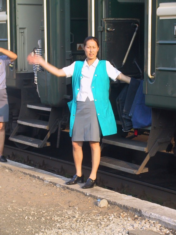 Grijs mantelpakje, petje, hoge hakken. In elk rijtuig werken twee provodniki. Dat zijn de treinstewards en als het goed is staan zij volledig at your service. De provodniki moeten het rijtuig schoonhouden, de samowar opstoken, mogelijke problemen oplossen, de tickets controleren en soms verkopen (lees: doorverkopen). Als je uitstapt tijdens de tussenstops is het zaak om de dames en/of heren goed in de gaten te houden, want zij geven een signaal dat de trein weer gaat rijden. Alle passagiers worden er uitentreuren voor gewaarschuwd: mis de trein niet! Maar om dat wel te doen, hoef je geen baanbrekende toeren uit te halen. Dat is een simpele kwestie van eventjes niet opletten. Er is namelijk geen vertreksignaal, de trein begint gewoon te rijden. De provodniki zijn – als het goed is – wel met je begaan. Sta je in de buurt, dan wenken ze je. Sta je te ver weg, dan niet. Wat je ook doet, blijf naar de trein kijken: voor je er erg in hebt, is hij ervandoor en je kunt pas zeven dagen later weer weg. Verstoken in een Siberisch gehucht.”