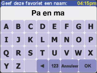 Je kunt je bestemming opslaan als favoriet. Je TomTom onthoudt het adres dan, waardoor je de volgende keer niet het volledige adres in hoeft te vullen, maar het adres eenvoudigweg uit de lijst met favorieten kunt kiezen. Een favoriet adres voeg je toe door in het hoofdmenu op ‘Voeg favoriet toe’ te klikken. Geef vervolgens het adres aan en druk op ‘OK’. Wanneer je een route wilt plannen naar dit adres, kies je in het menu ‘Navigeer naar...’ voor ‘Favoriet’. Je kunt de gewenste favoriet dan uit de lijst selecteren.