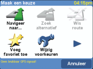 - Stadscentrum: Tik op het scherm om in het hoofdmenu te komen. Klik op ‘Navigeer naar...’ en selecteer vervolgens ‘Adres’. Klik nu op ‘Stadscentrum’. Gebruik het toetsenbord om het juiste stadscentrum in te voeren. Als je het groene scherm ziet waarin de route afgebeeld is, druk je op OK. De route gaat dan van start.