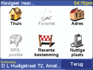 - Specifiek adres: Tik op het scherm om in het hoofdmenu te komen. Klik op ‘Navigeer naar...’ en selecteer vervolgens ‘Adres’. Gebruik vervolgens het toetsenbordje om de gewenste plaats in te voeren. Selecteer de plaatsnaam, zodra deze in het rijtje verschijnt. Voer vervolgens op dezelfde manier de straat in. Als je het groene scherm ziet waarin de route afgebeeld is, druk je op OK. De route gaat dan van start.