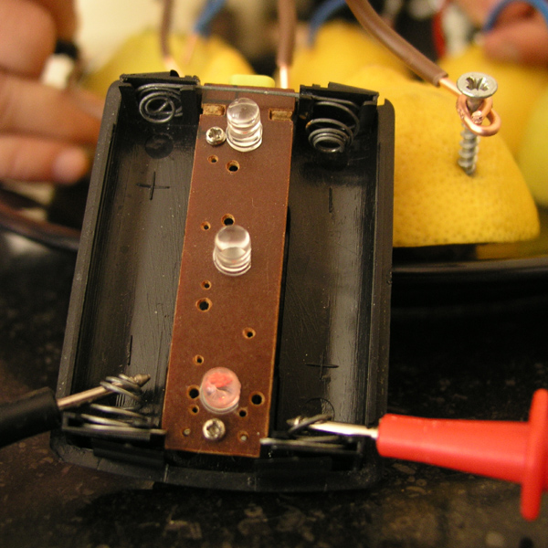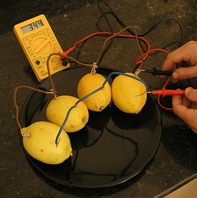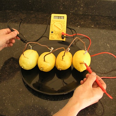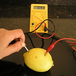 Een batterij bestaat grofweg uit drie onderdelen: een deel dat elektronen levert, een deel dat elektronen opneemt en een deel waardoorheen die elektronen zich kunnen verplaatsen. Dit laatste heet het elektrolyt. Veel elektrolyten zijn vloeistoffen. Huishoudazijn werkt goed, net als zeewater of kraanwater met keukenzout. Vruchtensap werkt ook. Zelfs als het nog vast zit in de vrucht, zoals het sap van een citroen. Neem voor dit experiment een citroen als elektrolyt.