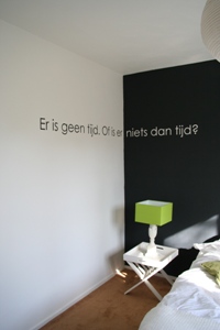 - Wees creatief, niet alleen met de kwast maar ook in je gedachten. Het babybedje in de kinderkamer, de muur in het trappengat, vrijwel overal is plaats voor een tekst. Ook muurschilderingen buiten kunnen heel leuk zijn: op de schutting in je tuin bijvoorbeeld of op de garagedeur. Werkelijk niets is ‘te gek voor woorden’.