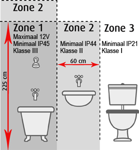 Ook als je wel een aardlekschakelaar hebt, zul je strenge veiligheidseisen in acht moeten nemen. De badkamer wordt daarvoor ingedeeld in zones: